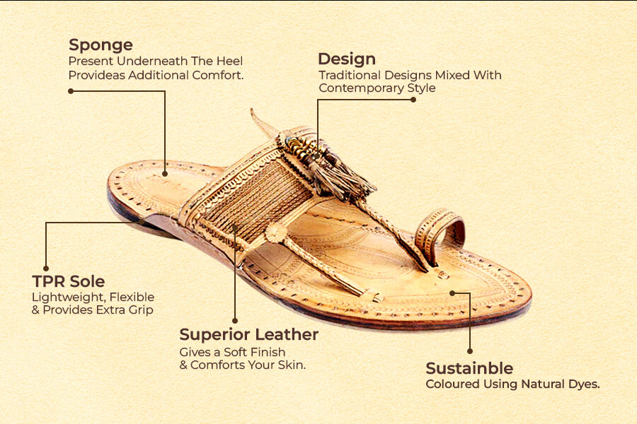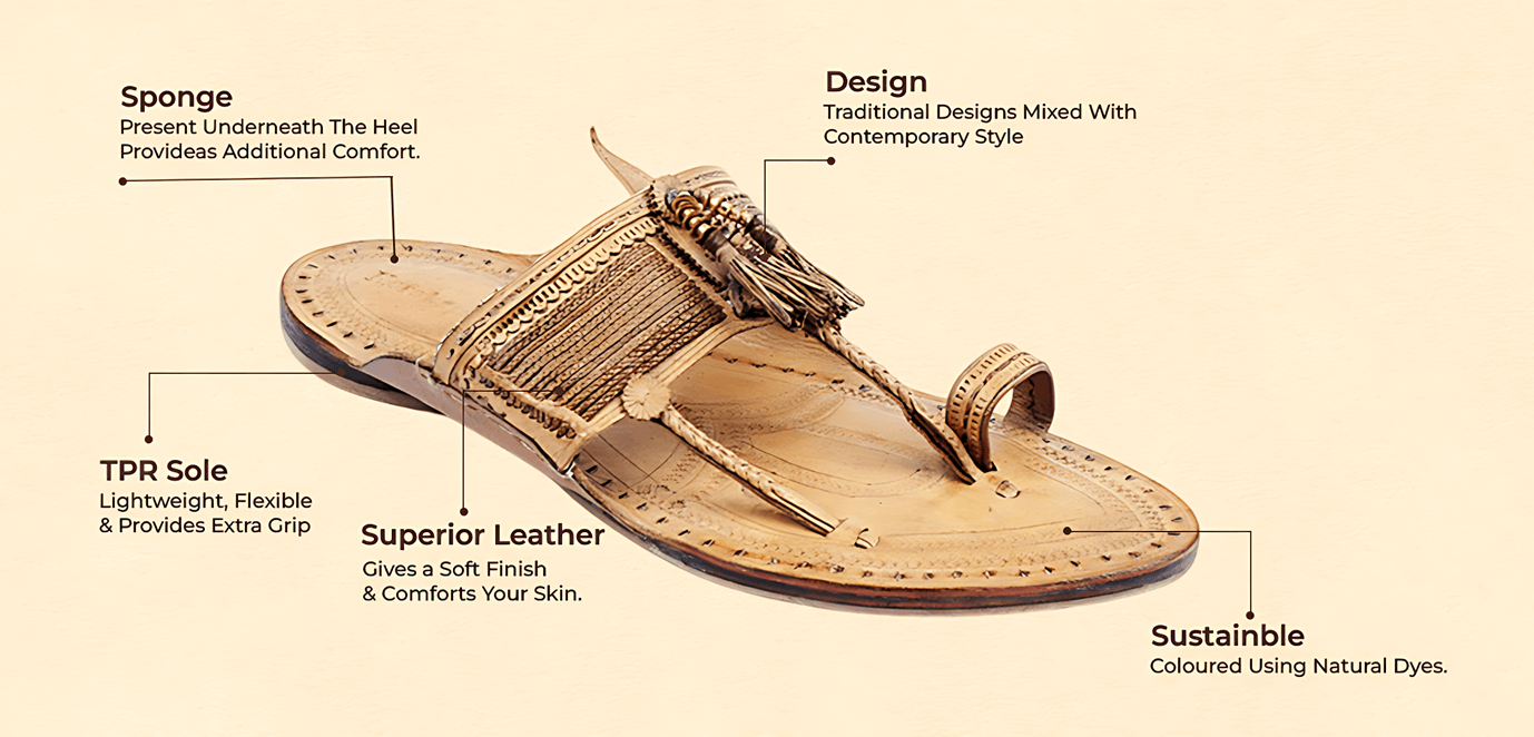Kolhapuri chappals, which are handmade leather sandals with a sought-after Gl tag, have been produced in the Kolhapur region of India since the 13th century.They have become extremely popular among men and women as both casual and formal footwear, thanks to their sharp style and long-lasting features. KORAKARI is India's top brand of genuine Kolhapuri chappals due to their unique designs and durability. Additionally, we utilize high-quality pure leather that undergoes traditional Kolhapuri production techniques.